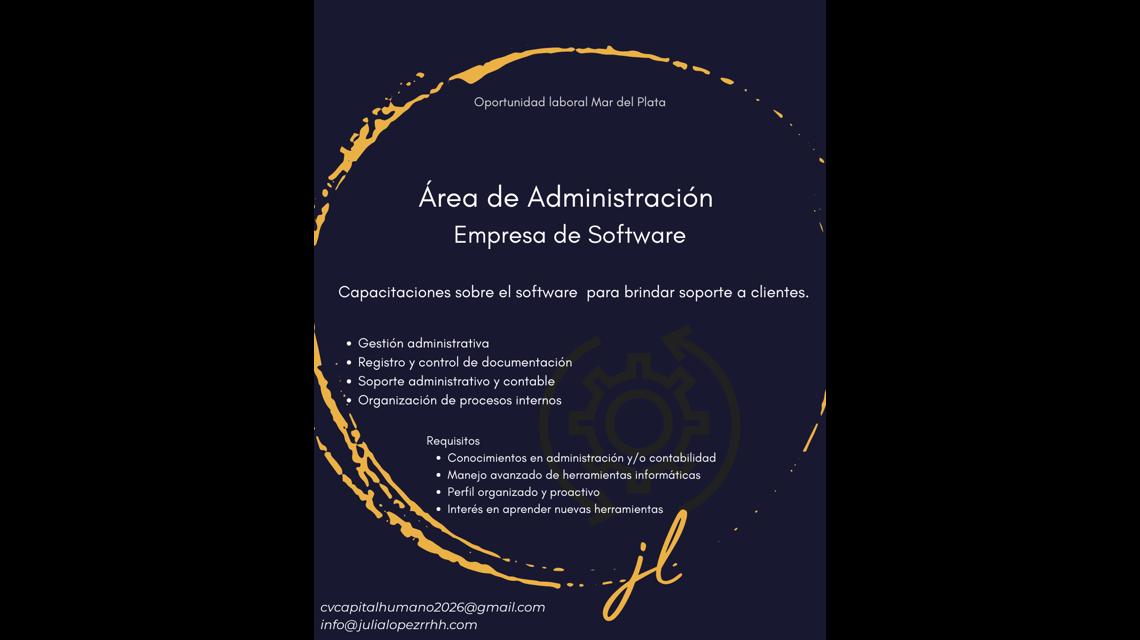 La posición combina tareas administrativas de soporte con un rol activo en la formación y aprendizaje del sistema, orientado a brindar asistencia a clientes.
